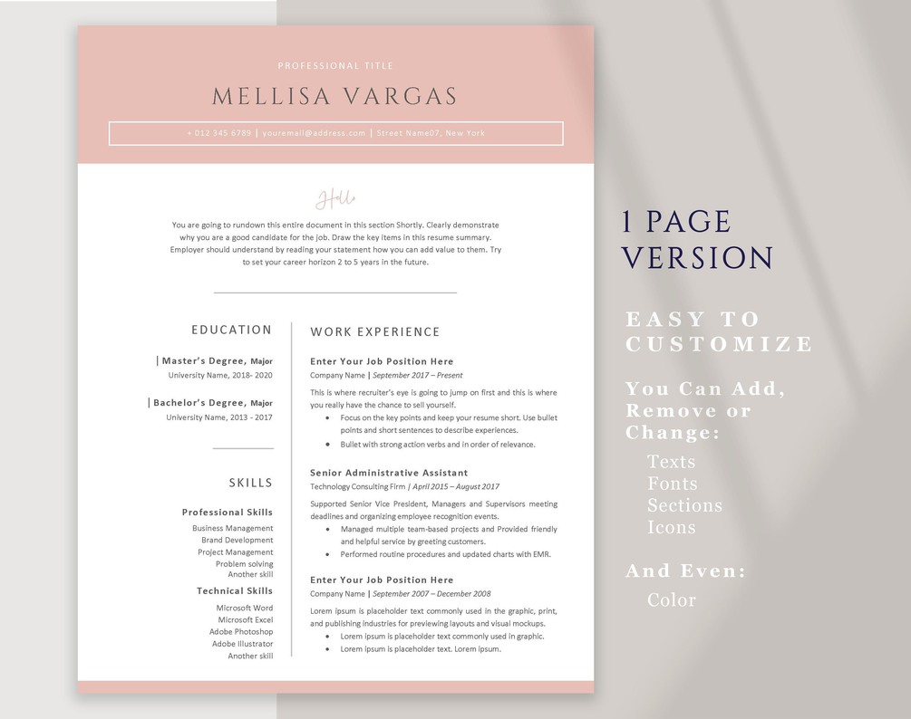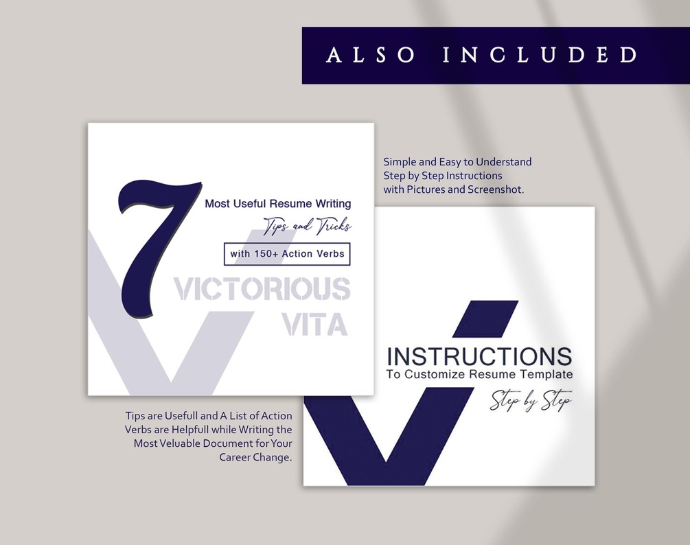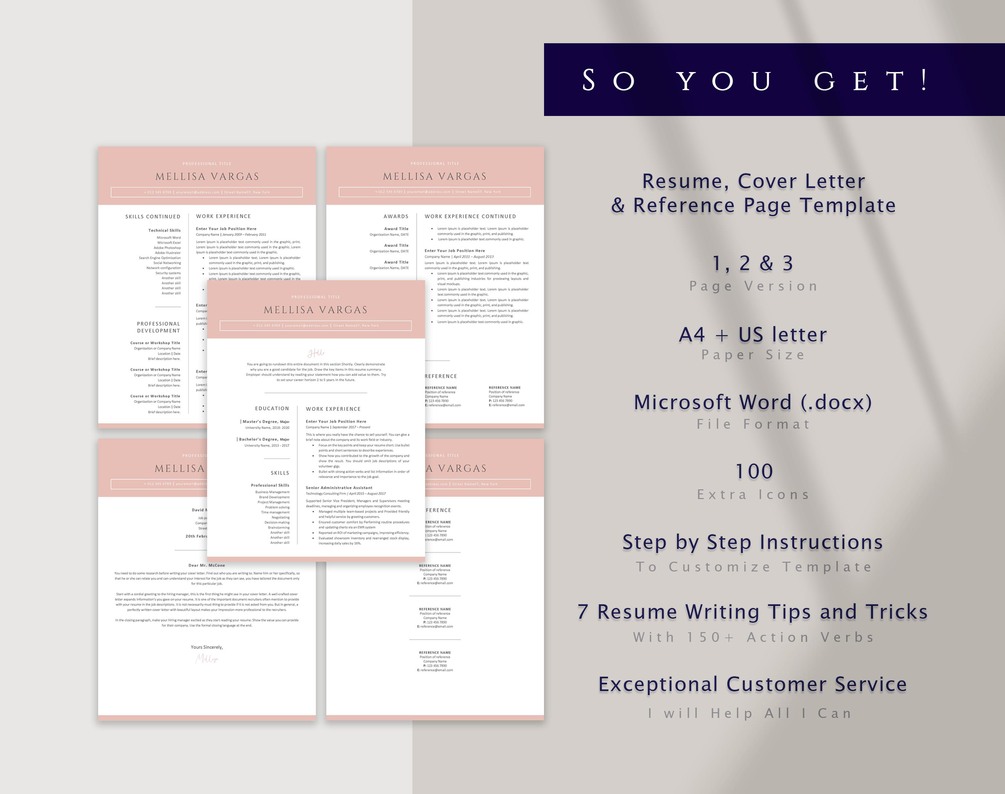 Professional resume template with cover letter and reference page, MS word file format, A4 and US letter size, 1 page resume template version, 2 page resume template version, 3 page resume template version, 100 + Extra Icon set, Step by step template customization PDF Guide, Resume Writing Guide with Useful Action Verbs and an Extra Ordinary Customer Service.