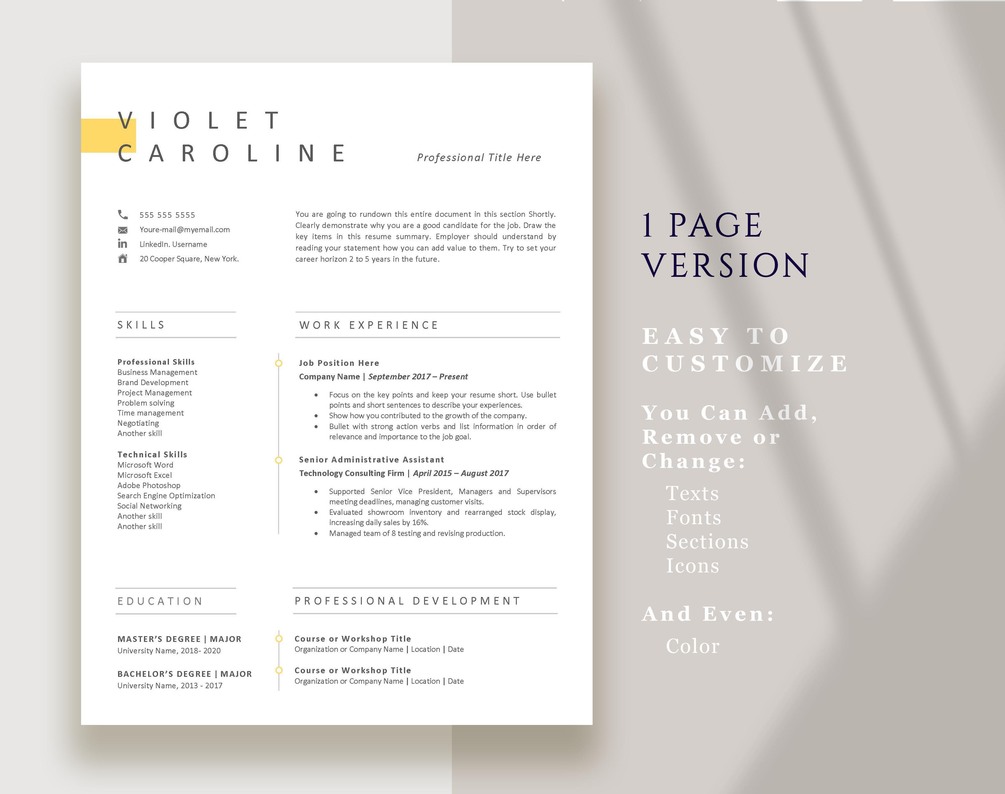 Professional resume template with cover letter and reference page, MS word file format, A4 and US letter size, 1 page resume template version, 2 page resume template version, 3 page resume template version, 100 + Extra Icon set, Step by step template customization PDF Guide, Resume Writing Guide with Useful Action Verbs and an Extra Ordinary Customer Service.