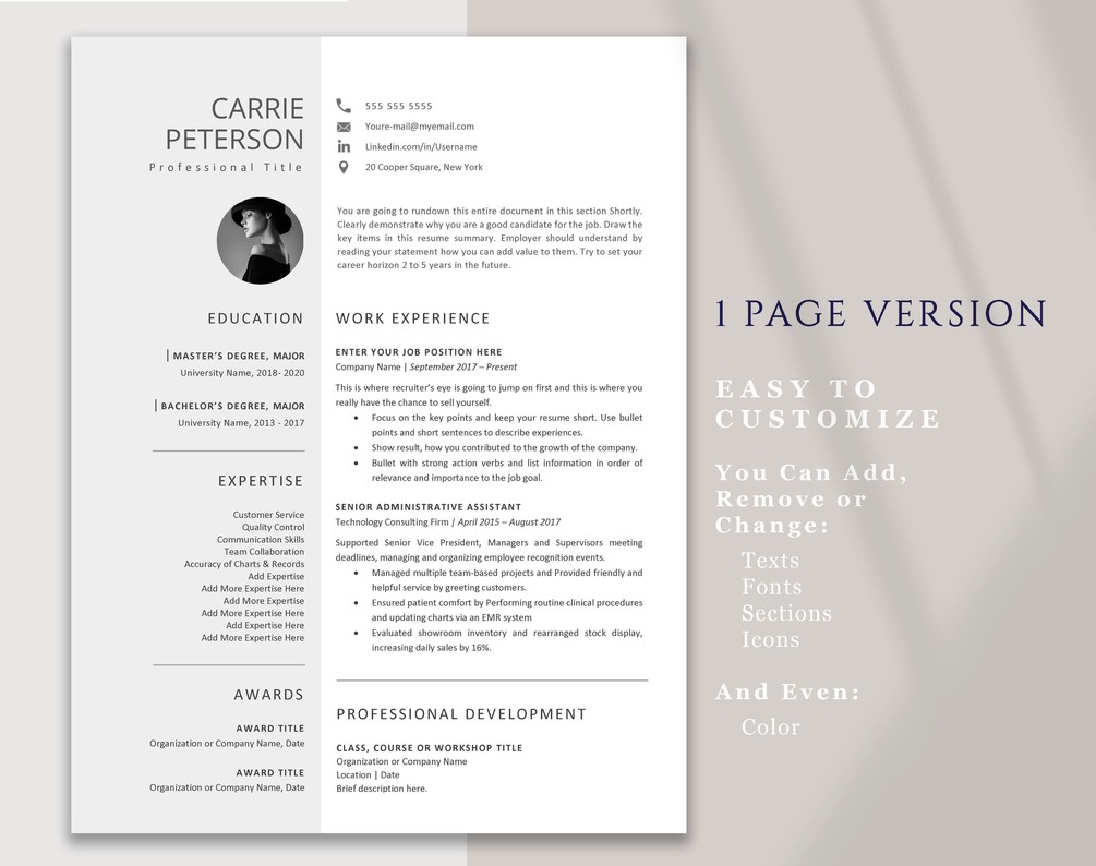 Professional resume template with cover letter and reference page, MS word file format, A4 and US letter size, 1 page resume template version, 2 page resume template version, 3 page resume template version, 100 + Extra Icon set, Step by step template customization PDF Guide, Resume Writing Guide with Useful Action Verbs and an Extra Ordinary Customer Service.